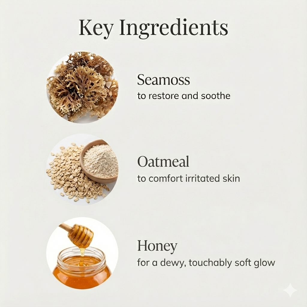 The Sea Moss, Honey & Oatmeal Soap is a handcrafted bar created through the traditional cold-process method, designed especially for sensitive skin. Rich in mineral-packed sea moss, it soothes dryness and supports skin resilience, while finely ground oatmeal calms irritation and gently polishes without stripping natural oils. This sulfate-free bar helps relieve discomfort from conditions like eczema and psoriasis, leaving the skin nourished, balanced, and comforted. Rooted in Ayurvedic care, it transforms daily cleansing into a ritual of gentle restoration.